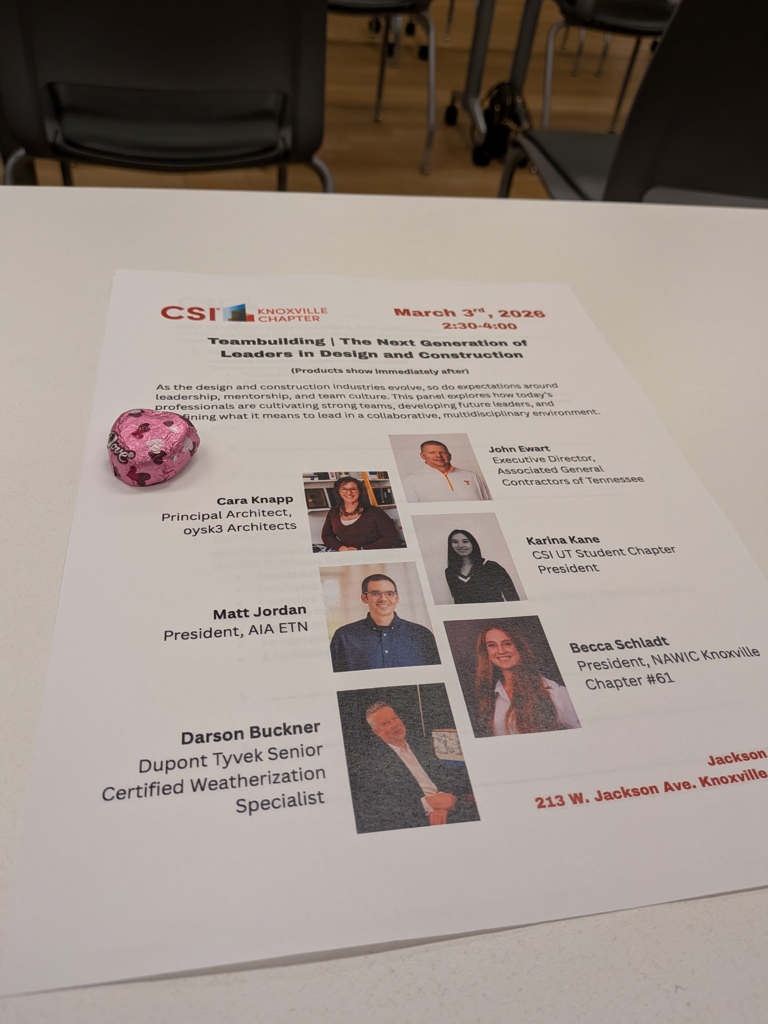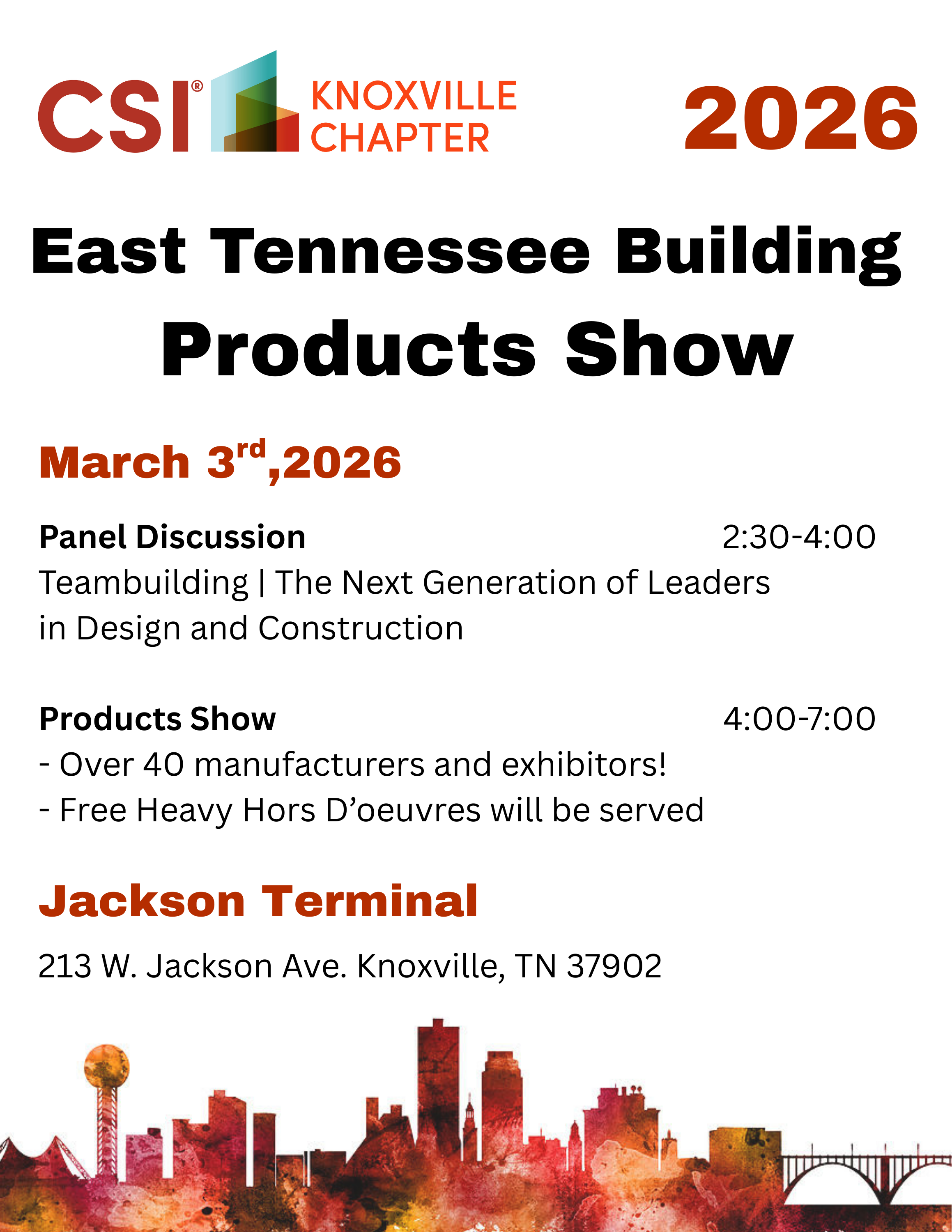 The East Tennessee Building Seminar & Product Show will be held on March 3, 2026 at the Jackson Terminal, 213 W. Jackson Ave. The continuing education seminar is titled Teambuilding | The Next Generation of Leaders in Design & Construction from 2:30 - 4 PM. The Product Show will open at 4 PM with over 40 manufacturers and exhibitors.